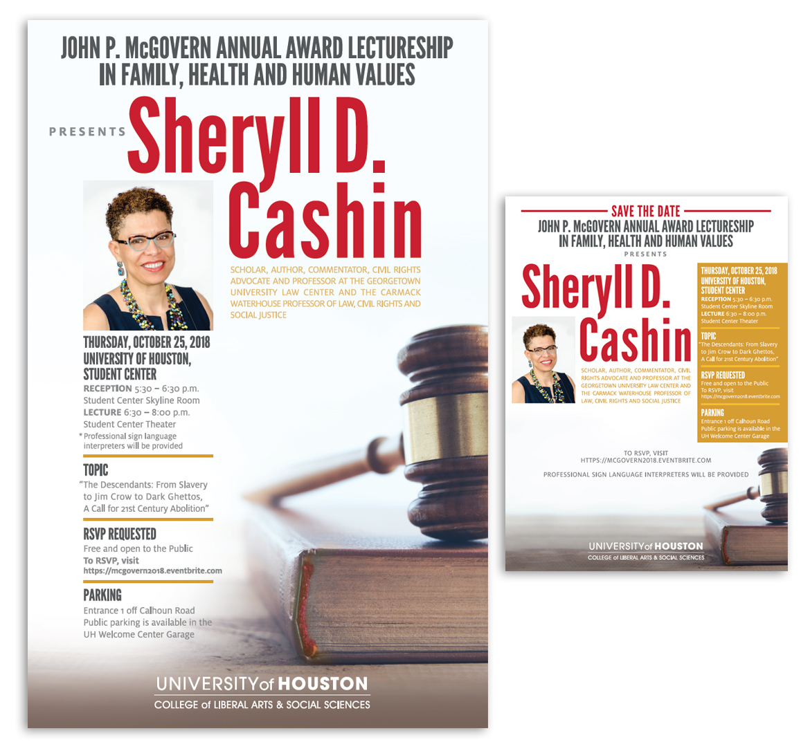 Poster and save the date postcard for the University of Houston’s College of Liberal Arts & Social Sciences John P. McGovern Lecture series.