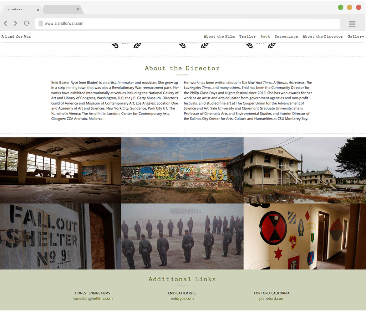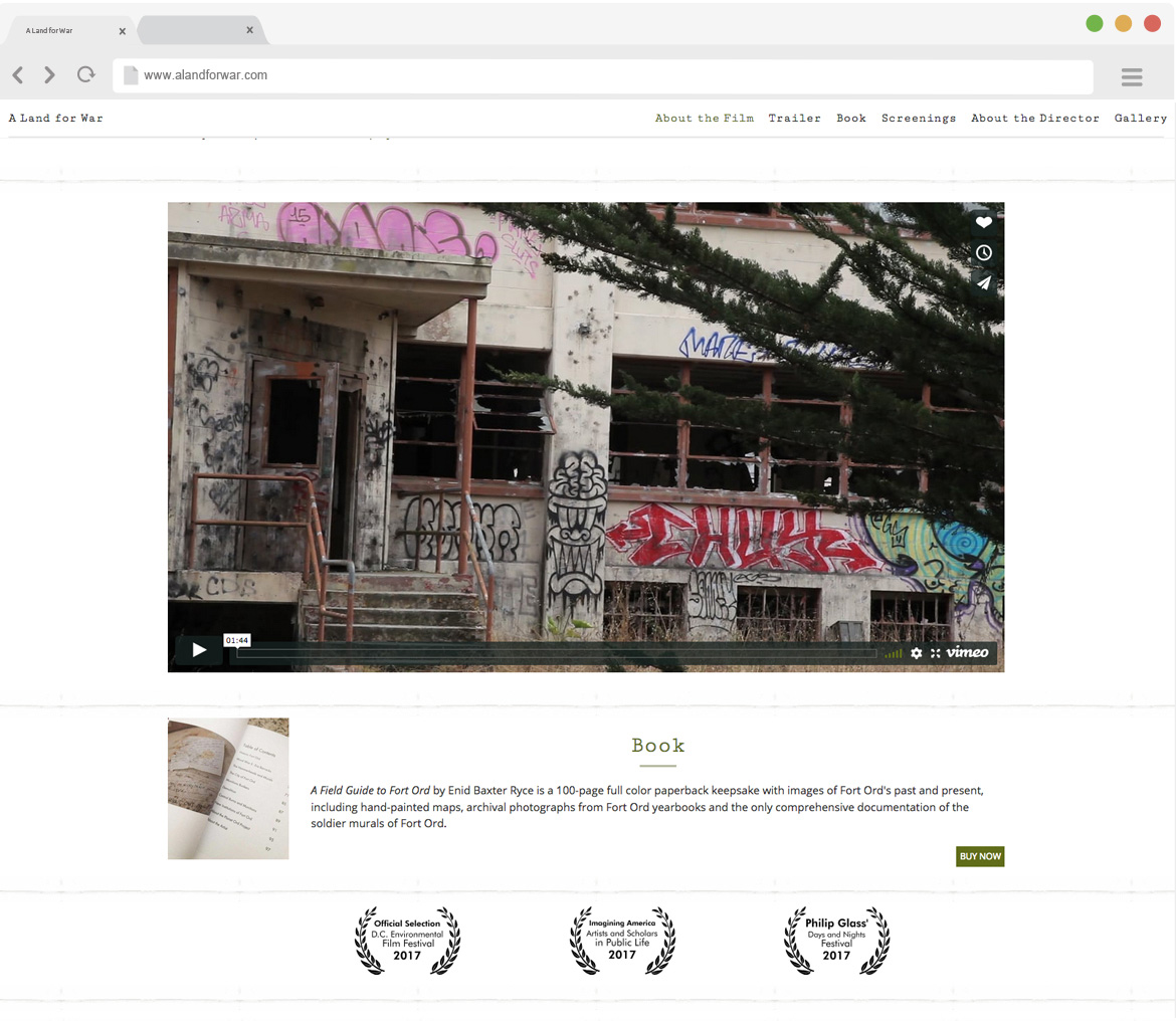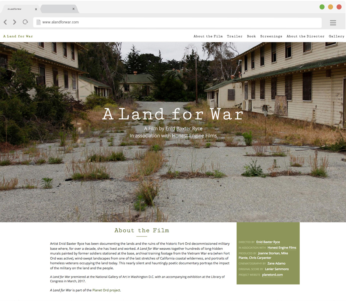 This website was built to promote the film A Land for War. This documentary makes use of archival footage, still photography and video shot by Enid Baxter Ryce of the current state of the historic Fort Ord military base. Rrelying on the ambiant sounds and the soundtrack, this is very much the film of a poem. The website has information about the creators, a trailer, stills from the fikm and information about the accompaying book.