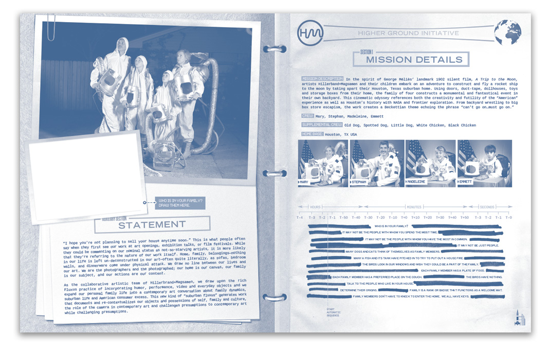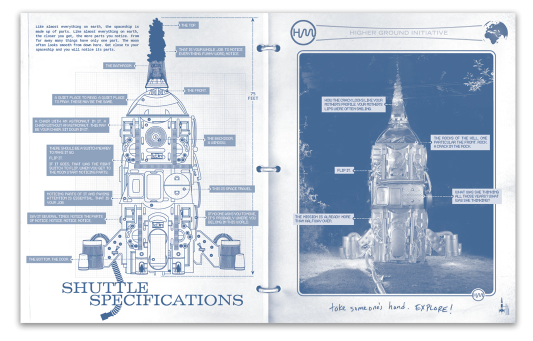 Created for their exhibit at The Everson Museum of Art, this sixteen page manual for Hillerbrand+Magsamen’s piece Higher Ground, this was designed to be played with. Included in the manual are spaces to draw in, mad libs, mazes, coloring pages, instructions to create your own helmet, poems, and paper dolls.