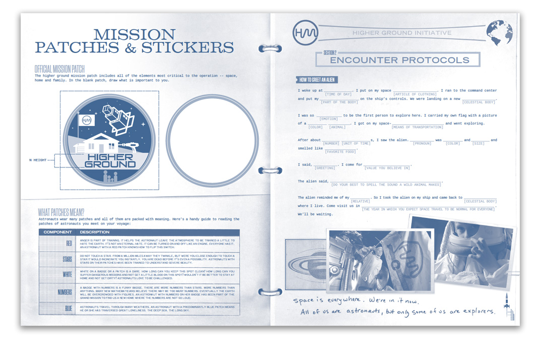 Created for their exhibit at The Everson Museum of Art, this sixteen page manual for Hillerbrand+Magsamen’s piece Higher Ground, this was designed to be played with. Included in the manual are spaces to draw in, mad libs, mazes, coloring pages, instructions to create your own helmet, poems, and paper dolls.