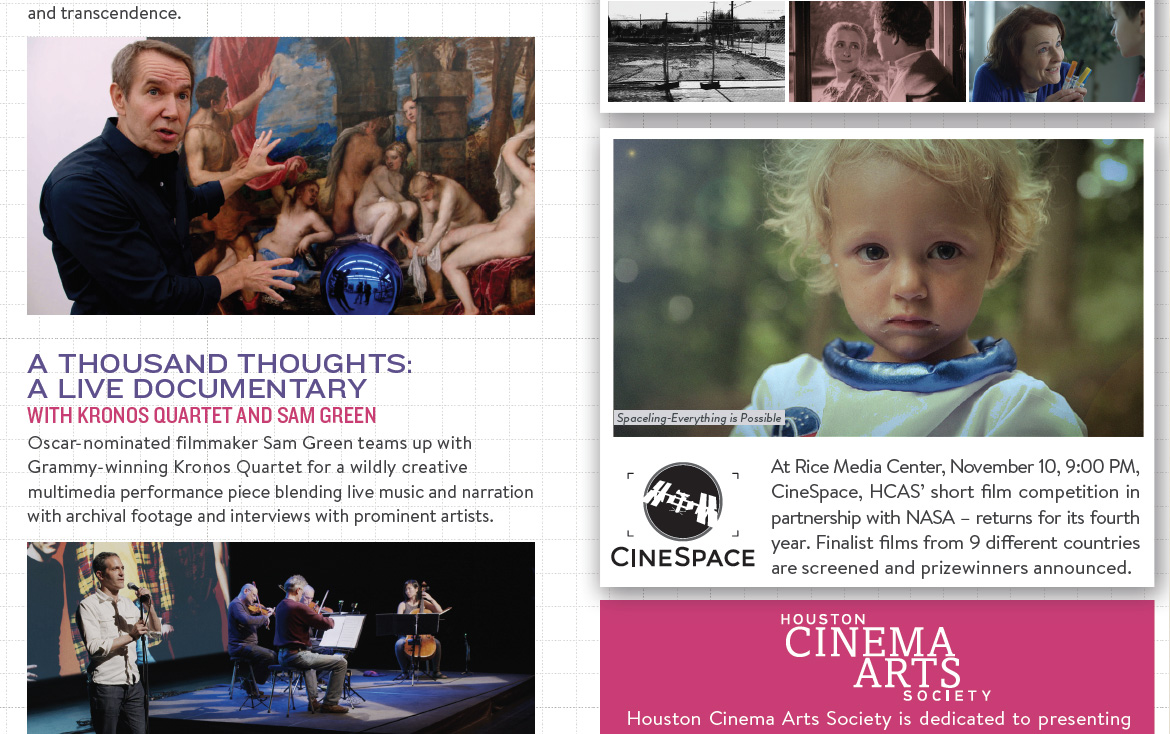 Several pieces are printed and around town now for the 10th Annual Houston Cinema Arts Festival. Pieces include an oversized postcard highlighting the Festival and Houston Cinema Arts Society year round programs and a Pocket Schedule for the Festival. The Pocket Schedule includes a color coded schedule to make it easier for film goers to navigate the 5 day, nine venue, 30+ event Festival.