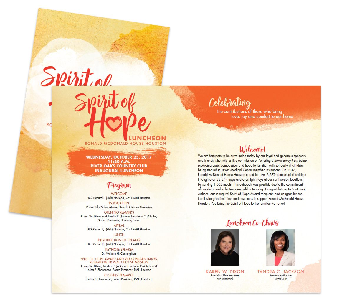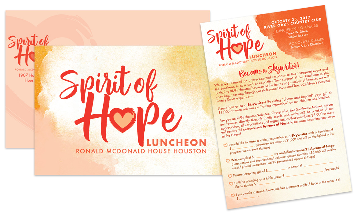 Sharp Egg worked with Ronald McDonald House Houston to build a brand identity for their fundraising luncheon, Spirit of Hope. This luncheon will take place every other year with the first recipiant Southwest Airlines. Southwest Airlines does a tremendous amount for Ronald McDonald House Houston, and an order to honor them, a heart (reminisicent of their logo) was requested to be somehow incorporated into the logo for the luncheon.