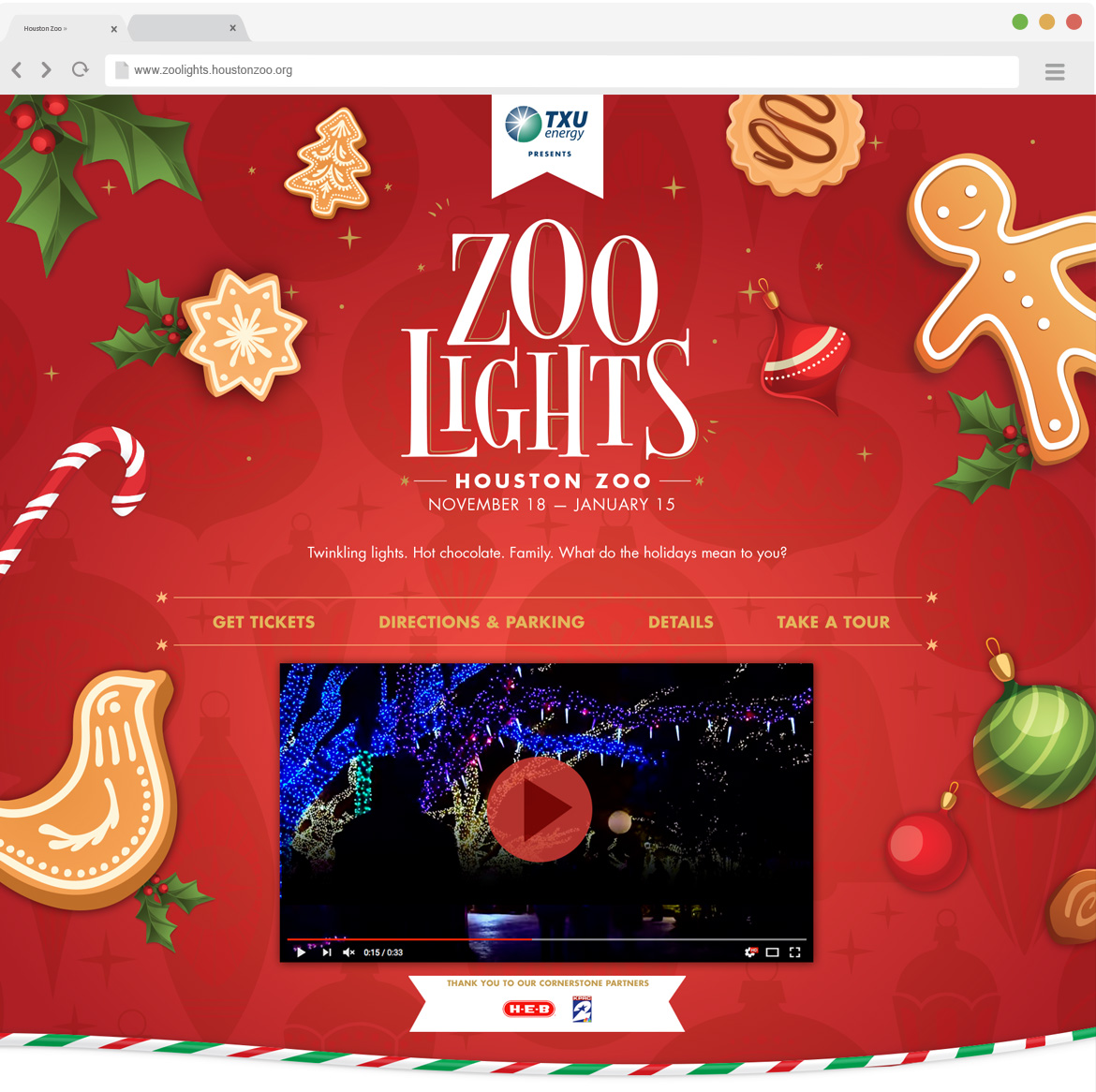 Sharp Egg worked with the design team at the Houston Zoo to translate their print pieces into a web presence for the annual event Zoo Lights.The website was designed keeping in mind that the average user would use this on their phone.